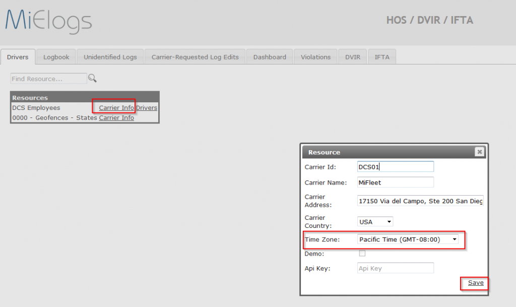 Carrier Info > Time zone > Save