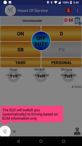 Single driver logged in the app: If ECM is available, once the vehiclestarts moving the driver is automatically switched to Driving mode after thevehicle moves 1 mile. The driver is not notified and is switched toDriving mode after the 1 mile. If ECM data is not available, the app will usethe new location service toggle. If location service is enabled thedriver is switched to Driving after the vehicle moves 1 mile. If locationservice is turned off, (and ECM data is not available) the driver will notbe switched to Driving mode.